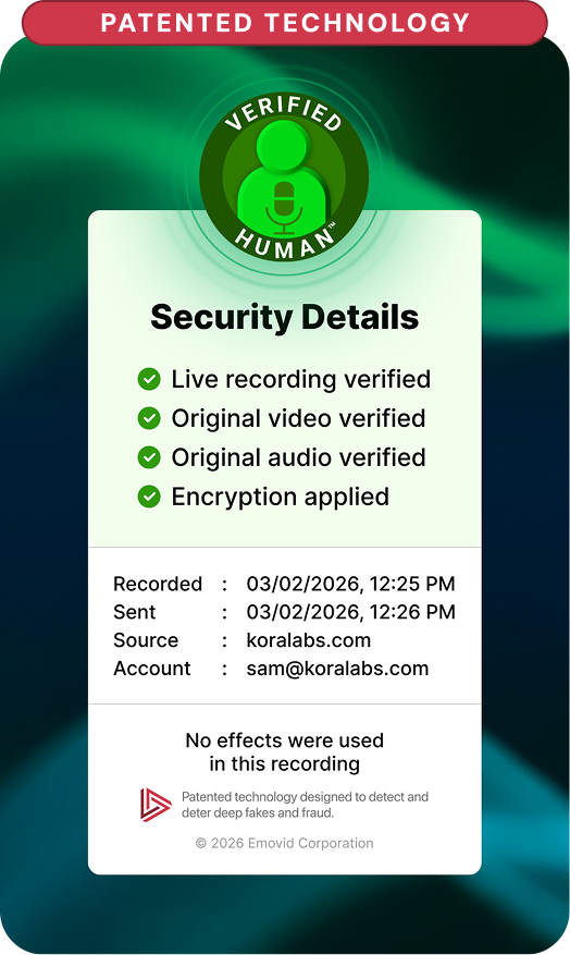Emovid is the first communication platform built to address this risk. Our patented system cryptographically validates the origin, integrity, and humanity of every message sent through the platform. Each Emovid carries a visible seal — your recipients see proof, not just a promise, that the message came from you: unaltered, and unmanipulated.